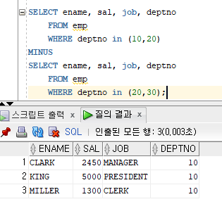 ▷ deptno 가 10,20 - (빼기) deptno 가 20,30 = deptno 가 10