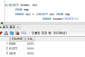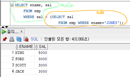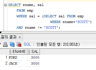 그래서 JONES의 월급을 검색하고 (서브쿼리)