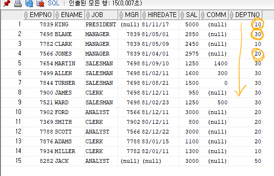 ▼ DEPT테이블에 있는 부서 번호(deptno)가