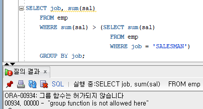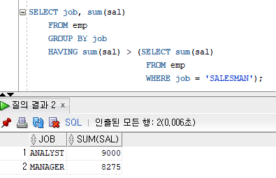 - 그룹함수로 검색된 데이터 간의 비교 방법