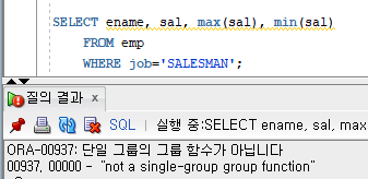 ▼ 직업이 SALESMAN인 사원의 최대 월급, 최소 월급, 이름, 월급 출력