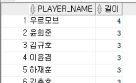 SELECT PLAYER_NAME, LENGTH(PLAYER_NAME) AS 길이