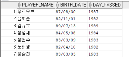 SELECT PLAYER_NAME, BIRTH_DATE, TO_NUMBER(TO_CHAR(BIRTH_DATE, 'YYYY')) AS DAY_PASSED