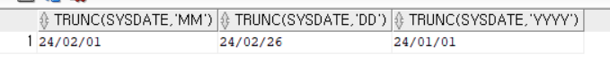 SELECT TRUNC(SYSDATE, 'MM'),TRUNC(SYSDATE, 'DD'), TRUNC(SYSDATE, 'YYYY')