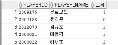 SELECT PLAYER_ID, PLAYER_NAME, MOD(PLAYER_ID,4) 그룹