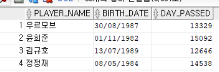 SELECT PLAYER_NAME, BIRTH_DATE,TRUNC(SYSDATE - BIRTH_DATE) AS DAY_PASSED FROM PLAYER;