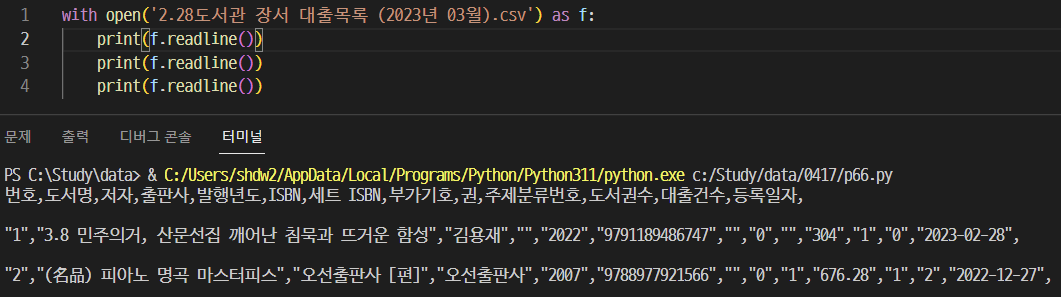 - with문으로 파일을 연다음에 readline(), 한줄씩 읽어주는 함수 로 출력해보자
