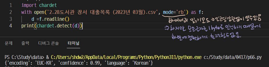 > import chardet / chardet.detect() 함수로 문자 인코딩 방식을 알아내서 인코딩 형식을 지정해줘야함