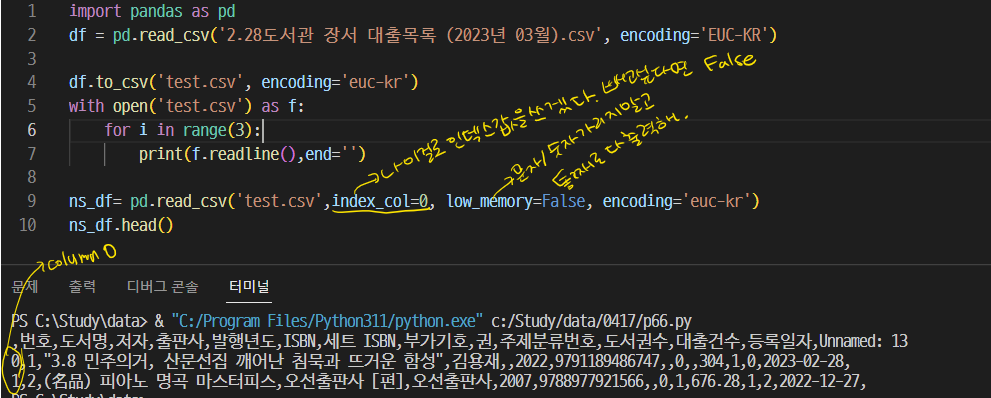 ** 가끔 DtypeWarning 이라는 오류가 발생하는데, 데이터 타입이 자동으로 파악한 타입과 달라지면 경고가 발생함