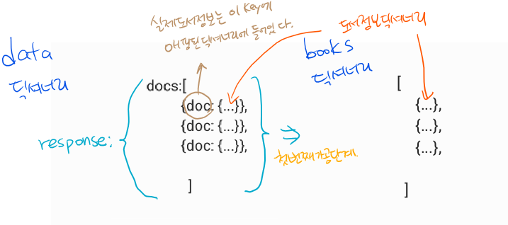 불필요한 데이터인 response: docs:은 치워버리고 여기에 매핑된 리스트를 순회하면서 doc키에 매핑된