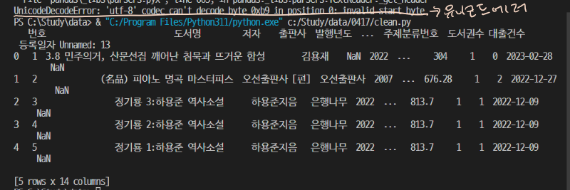 에러가 뜰 수 있는데 이것은 바로 csv가 utf-8이 아닌 'euc-kr'(주로 이거)나 'cp949' 로 되어 있기 때문...!