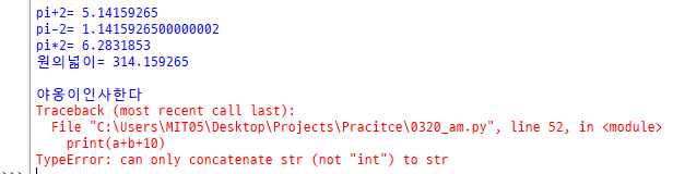 print("pi*2=",pi*2) #pi+"문자열"은 오류가 발생 될 것이다.