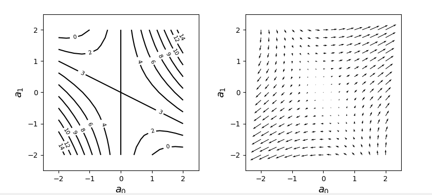 - 이것을 a_0, a_1 에 대한 편미분은 각각 a_0 방향의 기울기, a_1 방향의 기울기로 만들어질 것이고