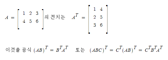 5. 전치 : 행렬에도 벡터처럼 전치 T를 사용할 수 있음.