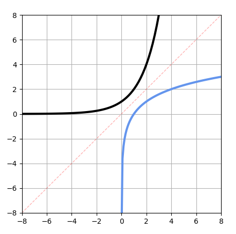 ▼ y = a^x 그래프와 y =x 선에서 대칭 (검정색 선이 지수함수 그래프)