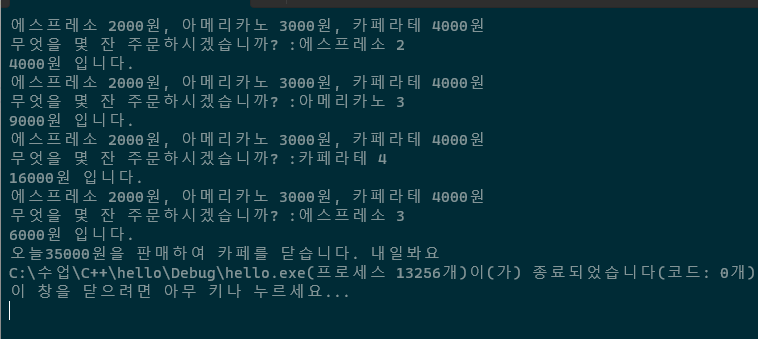 cout << "오늘" << total << "원을 판매하여 카페를 닫습니다. 내일봐요";