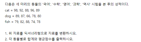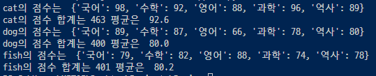 print("dog의 점수 합계는",sum(dog), "평균은 ", sum(dog)/len(dog))