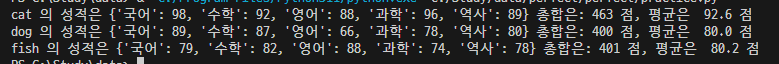 print(name,"의 성적은", score, "총합은:",sum,"점, 평균은 ",sum/len(subject),"점")