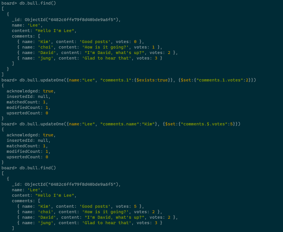 4-1. 위치 연산자를 사용하여 Lee의 게시물에 대한 Kim의 댓글의 투표 값을 5로 설정합니다.