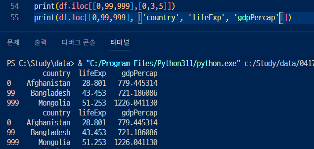 ▶▶ loc나 iloc는 행과 열을 같이 선택해서 데이터를 추출할 수 있음.