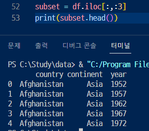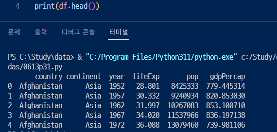 > DF에서 가장 앞에 있는 5개의 행을 출력