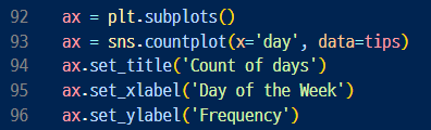 - countplot 메서드에 tips 데이터프레임의 day열 데이터를 넣어 그림